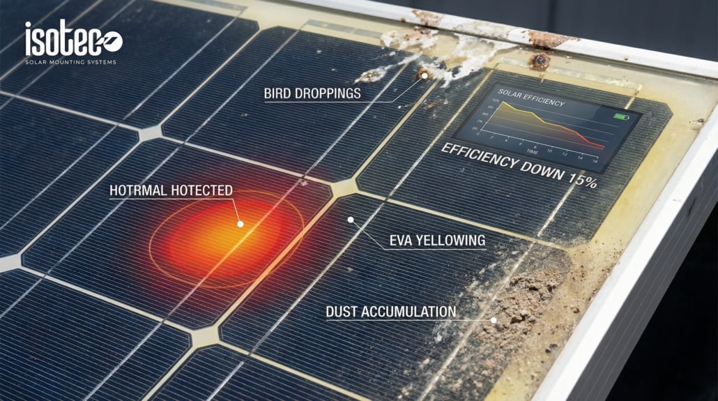 Güneş panelleri, dış ortam koşullarına bağlı olarak TOZ, KİR, YAPRAKLAR gibi etkenlerden etkilenebilir. Panelin üzerindeki kirler, güneş ışığının PANEL YÜZEYİNE ULAŞMASINI ENGELLEYEBİLİR, bu da verim kaybına yol açar.